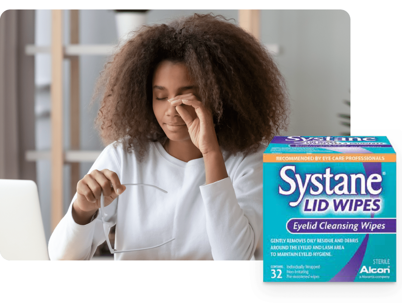 Using hypoallergenic lid wipes daily is best practice to help reduce harmful bacteria. Systane® Lid Wipes gently remove oily residue and debris around the eyelid and lash area to help maintain good eyelid hygiene.